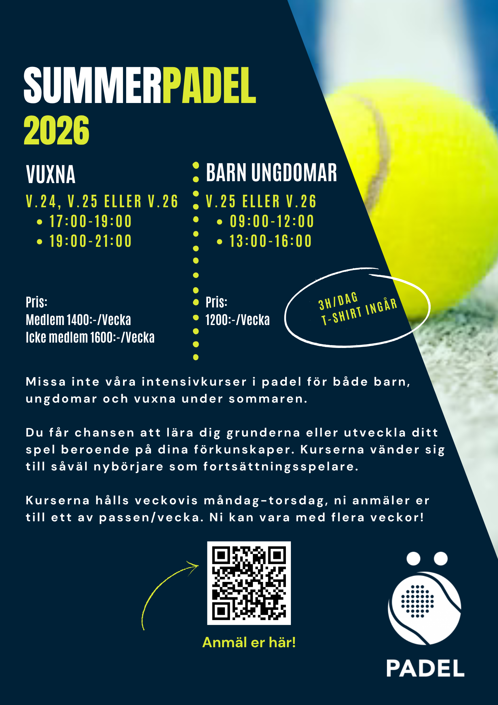 SummerPadel kallar vi våra intensivkurser i padel för både barn, ungdomar och vuxna under sommaren, i år vecka 24 (endast vuxna), 25 och 26. Kurserna hålls veckovis måndag-torsdag.